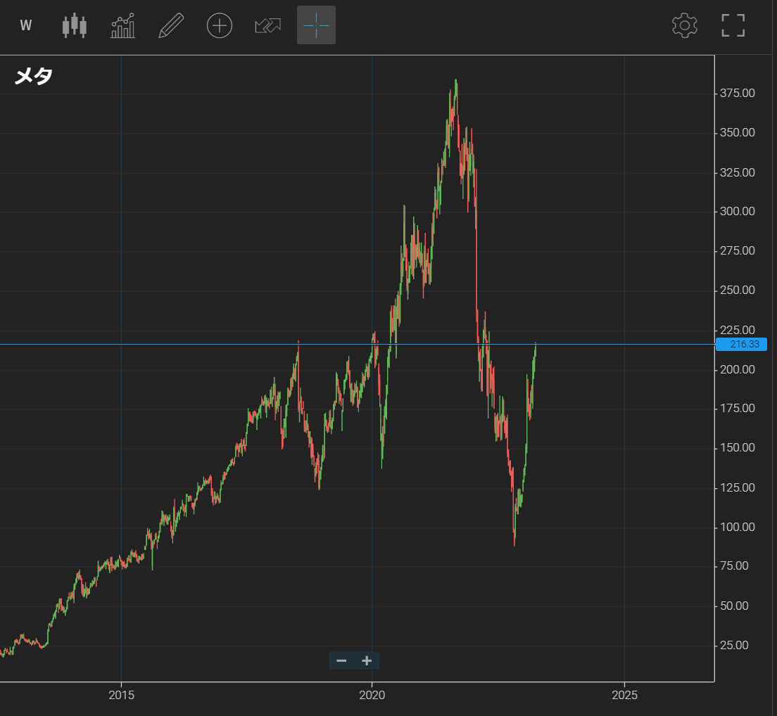 高値384ドルから90ドル前後まで下落したメタのチャートです。