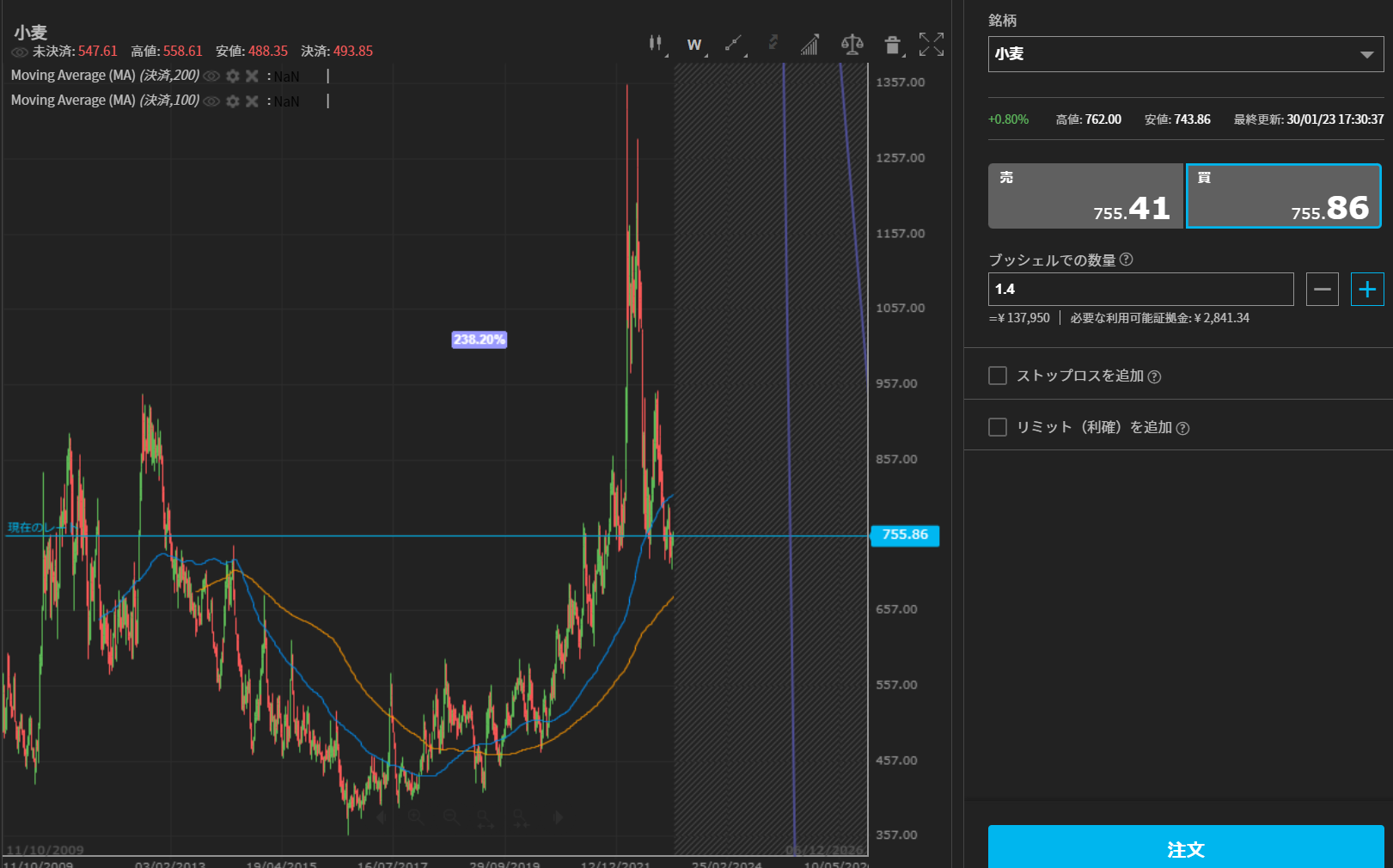 とはいえ、チャート的には今後小麦価格が需給の問題で上がるにせよ、上がらないにせよある程度の反発はあると思います。
