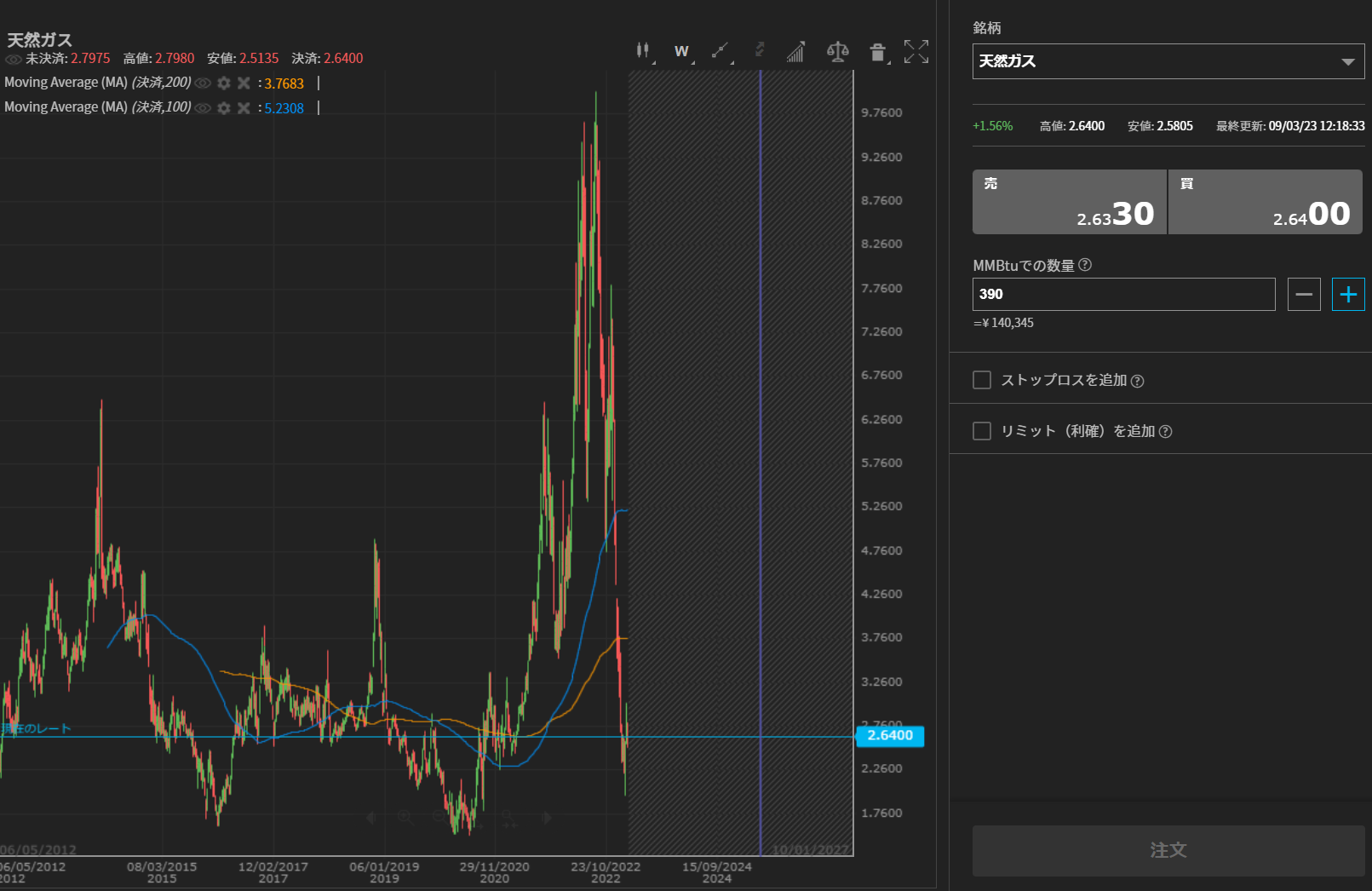 現在投資中 天然ガスがめちゃ下げてて安い admin358 2023年3月9日 / 2023年3月12日 記事内に商品プロモーションを含む場合があります 天然ガスが平均より安いから買ってみる 天然ガスが安い! 実需はどうなのかわかりませんが、なんか安い感じがします。 上昇も下落もたいてい相場は行きすぎるのでこの下げは行き過ぎということで最小ロットで買ってみました。 14万円分か、ちょっと大きいけども、、、 インフレはずっと続いてますし今よりは多少上げるんじゃないだろうかという適当な理由です。 天然ガス
